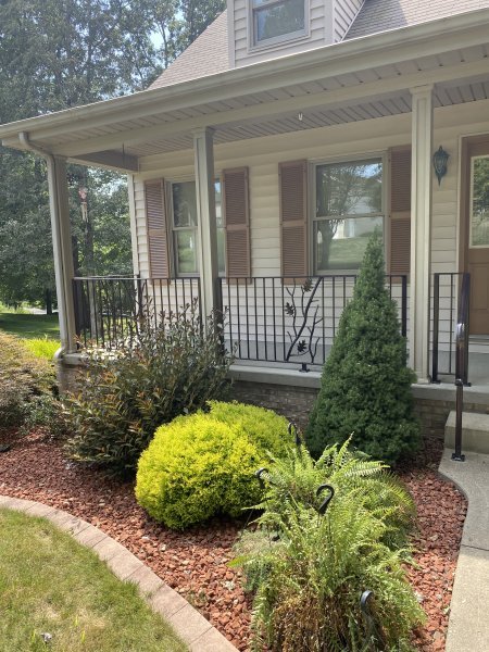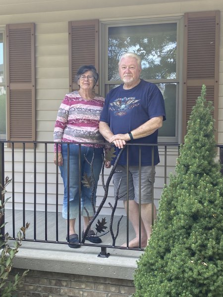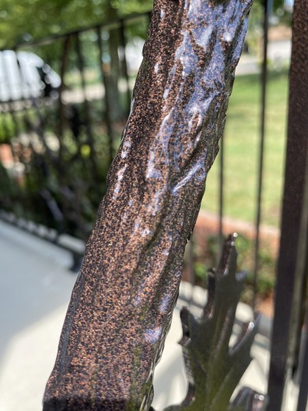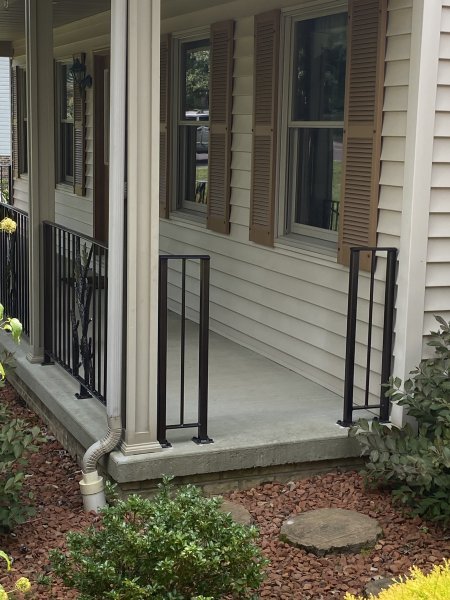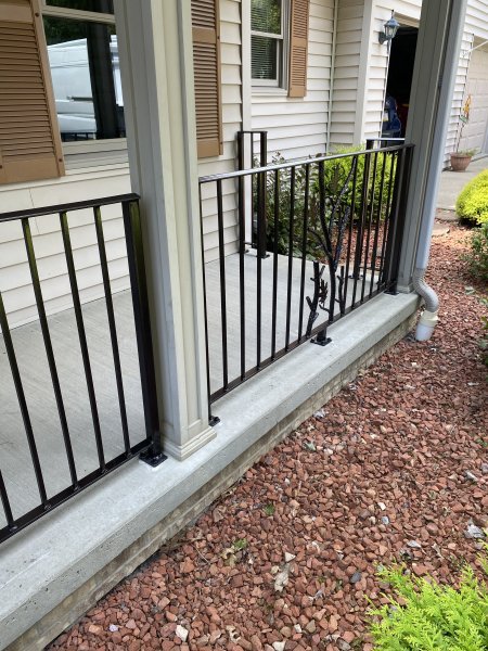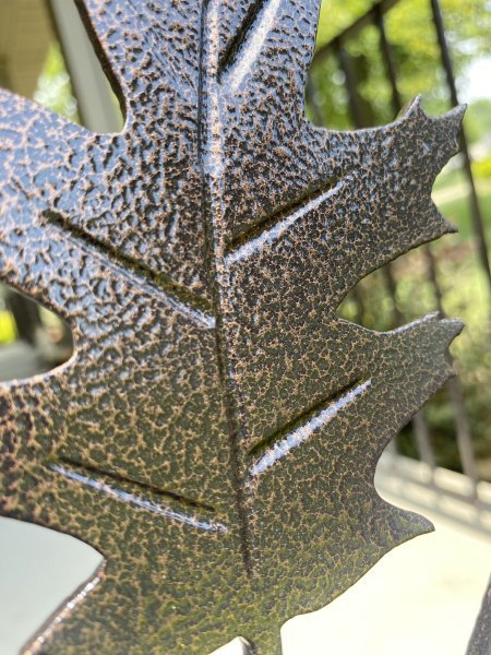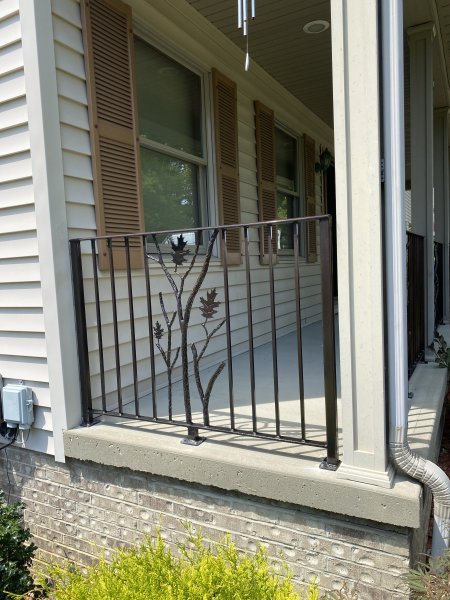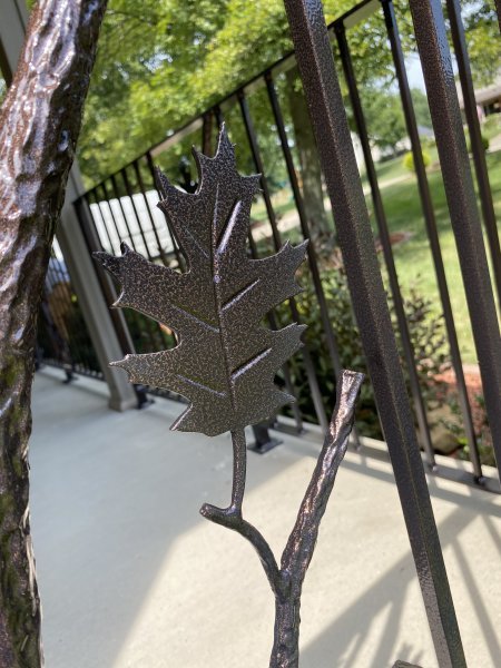 John & Karen reached out to us to see if we could build some decorative iron railings for around their porch. They really like the branches, leaves, and copper vein powder coating. So we should them a few examples of the branches, picked a leaf out, and showed them the copper vein finish. The branches and leaves are very time consuming. Everything is heated up in the forge to give the branches the bark look, and the leaves even have veins in them! We heat the leaf up red hot! Then we use a chisel and make the vein lines in the leaves. We have youtube videos of how we do that. John & Karen loved the railings, and we really appreciated the work they gave us! This job is in Saxonburg Pennsylvania!