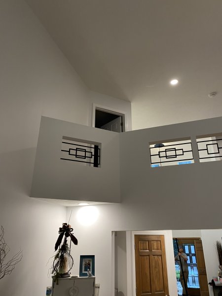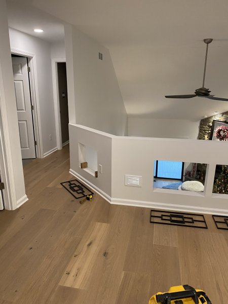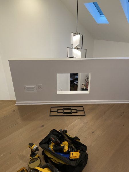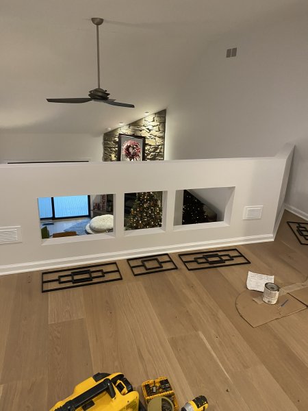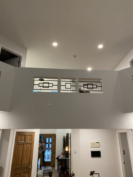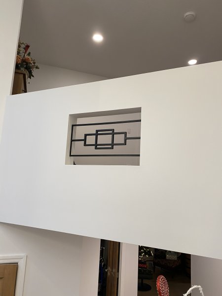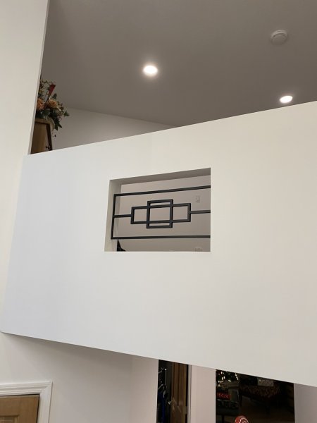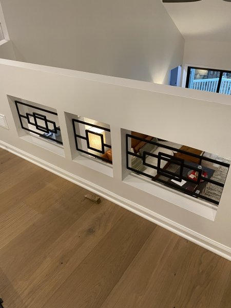We recently completed a custom interior iron feature installation for Rebecca and Ryan at their home in the Pittsburgh, PA area. This project involved designing, fabricating, and installing decorative iron panels within the square wall openings overlooking their main living space.