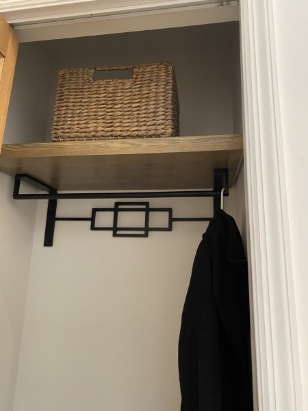 To create a cohesive design throughout the home, we carried this same geometric pattern into additional custom pieces. We fabricated a matching custom shelf and clothes hanger for the primary closet, allowing the design to continue into the interior spaces in a subtle and functional way. In addition, we installed custom handrails throughout the house, providing added safety while maintaining a consistent modern iron aesthetic.